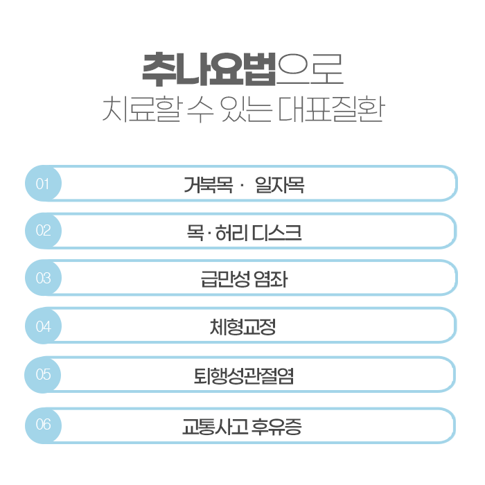 특히 거북목 증후군, 허리디스크, 골반 틀어짐, 어깨 결림, 무릎 불균형처럼 잘못된 자세나 근육 긴장에서 비롯된 만성 통증에 효과적입니다. 단순히 통증을 줄이는 데 그치지 않고, 재발을 예방하며 체형 균형을 유지하는 데에도 도움이 됩니다. 추나요법을 병행하면 몸의 움직임이 유연해지고, 운동 능력 향상과 피로 회복 같은 부수적인 효과도 기대할 수 있습니다.