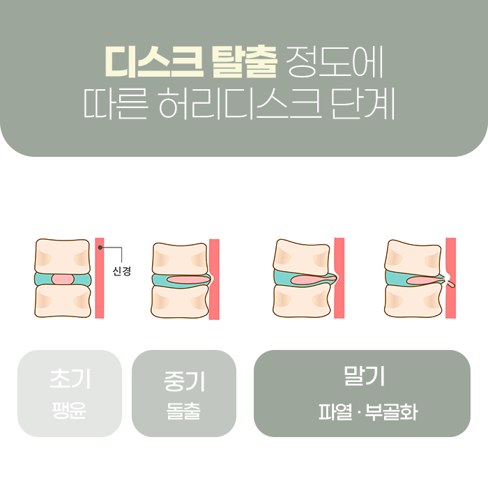 말기 단계: 수핵이 완전히 탈출해 신경을 강하게 누르며, 심할 경우 보행이 어렵거나 마비 증상이 발생할 수 있습니다.