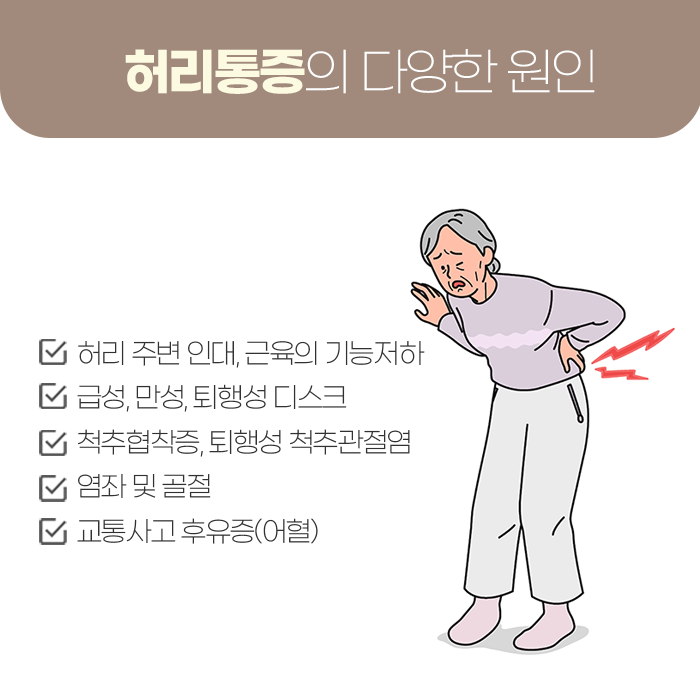 허리는 인체 중심부에 위치해 척추뼈, 근육, 인대, 디스크(추간판), 신경 등 다양한 구조가 정교하게 맞물려 있어, 이 중 어느 하나라도 손상되거나 긴장이 생기면 통증이 나타날 수 있습니다. 따라서 요통은 단일 질환이 아니라, 여러 근골격계 이상이 한데 어우러져 나타나는 신체의 종합적인 경고 신호라고 볼 수 있습니다.