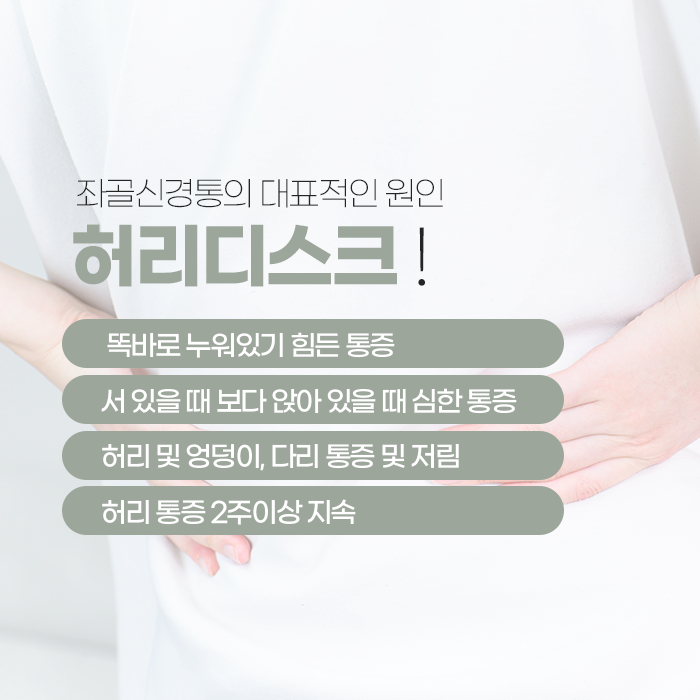 좌골신경통의 원인은 다양합니다. 허리디스크 외에도 척추관 협착증, 척추 전방 전위증, 근육 긴장, 이상근 증후군, 골반 구조 불균형, 외상 등이 주요 원인이며, 특히 중장년층에서 나타나는 퇴행성 변화와 장시간 앉아서 일하는 직장인의 생활 습관이 발병 위험을 높입니다. 잘못된 자세, 허리·복부 근육 약화, 무거운 물건을 반복적으로 드는 습관도 좌골신경에 부담을 주어 증상을 악화시킬 수 있습니다.