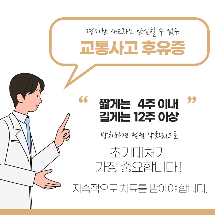 이러한 다양한 치료를 병행하면 통증 완화뿐 아니라 근본적인 신체 균형 회복과 재발 예방에도 도움이 됩니다. 사고 직후 증상이 경미하다고 치료를 미루면 손상 조직이 굳고, 신경이 민감해져 만성 통증이나 관절 질환으로 이어질 수 있습니다. 따라서 신속한 진단과 꾸준한 치료가 필수적입니다.