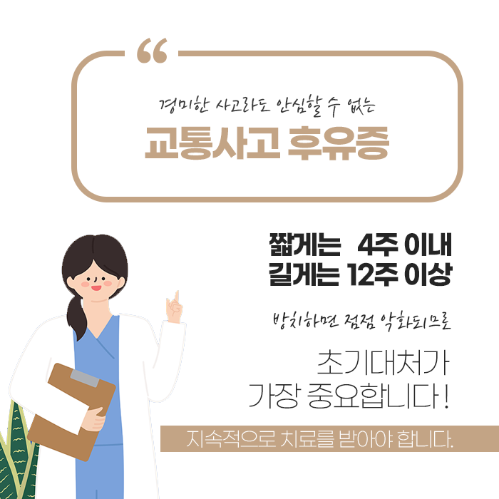 교통사고는 단 몇 초 만에 일어나지만, 신체가 받는 충격과 후유증은 오랫동안 지속될 수 있습니다. 외관상 큰 상처가 없더라도 사고 시 발생하는 강한 힘은 근육, 인대, 신경, 혈관 등 다양한 조직에 미세한 손상을 남길 수 있으며, 초기에는 긴장과 아드레날린 때문에 통증이 덜 느껴져 방치하기 쉽습니다. 그러나 시간이 지나면서 목, 어깨, 허리, 골반, 무릎 등 여러 부위에서 통증이 서서히 나타나고, 단순한 근육통으로 여기면 손상된 조직이 굳어 회복이 늦어지고 만성화될 가능성이 높아집니다.