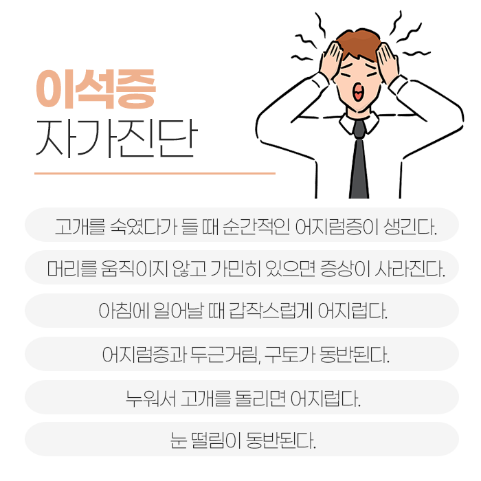 어지럼증은 흔히 피곤하거나 컨디션이 떨어졌을 때 일어나는 가벼운 증상으로 생각하기 쉽지만, 반복적으로 발생하거나 일상생활에 불편함을 줄 정도로 심해진다면 반드시 원인을 찾아야 합니다. 특히 이석증은 귀 속 전정기관에서 균형을 담당하는 작은 칼슘 입자인 ‘이석’이 제자리를 벗어날 때 발생하는 질환으로, 강한 회전감과 돌듯한 어지럼증을 유발하는 것이 특징입니다. 정상적인 전정기관에서는 이석이 특정 위치에서 움직임을 감지해 균형을 조절하지만, 외부 충격이나 혈류 저하 등 다양한 이유로 떨어져 나오면 세반고리관 내부를 자극해 실제로 움직이지 않아도 빙글빙글 도는 느낌을 만들어냅니다.