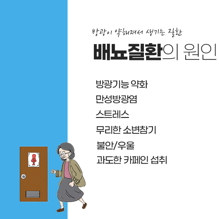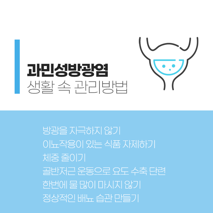 과도한 긴장과 스트레스는 배뇨를 자주 일으키므로 적절한 운동과 이완 활동을 통해 전반적인 몸 상태를 안정시키는 것도 필요합니다. 방광염이 원인일 경우에는 방치하지 말고 조기에 치료해야 하며, 소변을 참는 습관이나 찬 곳에서 오래 앉아 있는 습관은 피해야 합니다.