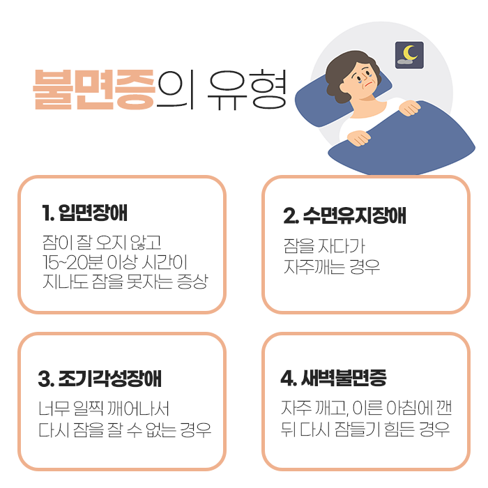 불면증은 충분히 잠을 잘 수 있는 환경이 마련되어 있음에도 잠들기 어렵거나, 자는 도중 자주 깨거나, 이른 새벽에 눈이 떠져 다시 잠들지 못하는 상태를 말합니다. 이로 인해 수면의 질이 떨어지고 낮 시간 동안의 활동에도 영향을 받게 됩니다. 불면증은 크게 세 가지 형태로 나눌 수 있습니다. 첫 번째는 잠자리에 누워도 쉽게 잠들지 못하는 경우로, 오랜 시간 뒤척이다가 잠이 드는 패턴이 반복됩니다. 이러한 상황이 지속되면 잠에 대한 부담감과 긴장이 커지면서 오히려 잠들기 더 어려워지는 흐름으로 이어질 수 있습니다.