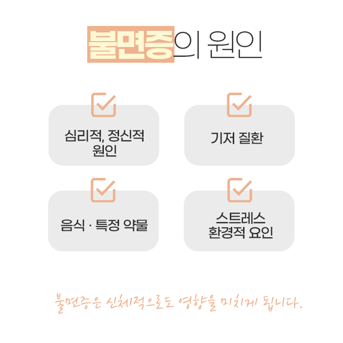 불면증이 생기는 배경은 매우 다양합니다. 스트레스와 걱정, 감정의 불안정, 카페인 섭취, 늦은 시간의 전자기기 사용, 야식이나 음주 습관 등이 수면을 방해할 수 있습니다. 또한 특정 질환이나 복용 중인 약물, 소음이나 조명 같은 외부 환경 요인도 영향을 미칠 수 있으며, 잠을 자야 한다는 압박감 자체가 오히려 수면을 방해하는 요소로 작용하기도 합니다.
