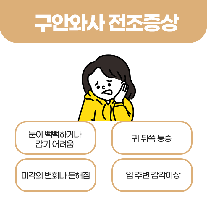 이와 함께 귀 뒤쪽 통증, 귀 주변의 불편감, 소리에 예민해지는 증상, 미각 저하, 이명 등이 동반되기도 합니다. 초기에는 단순한 피로나 일시적인 감각 이상으로 착각하기 쉬워 세심한 관찰이 필요합니다. 구안와사는 흔히 ‘골든타임’이 중요한 질환으로 알려져 있습니다.
