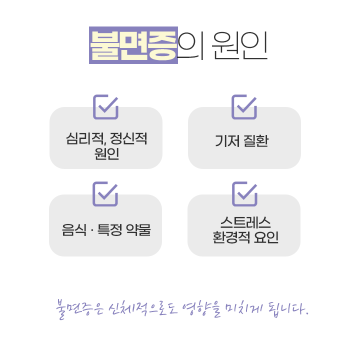 불면증이 발생하는 원인 또한 다양합니다. 과도한 스트레스와 걱정, 감정의 불안정, 카페인 섭취, 늦은 시간까지 이어지는 스마트폰 사용, 야식이나 음주 습관 등이 수면을 방해할 수 있습니다. 여기에 특정 질환이나 복용 중인 약물, 소음과 조명 같은 환경적 요인도 영향을 미칠 수 있으며, ‘꼭 자야 한다’는 압박감 자체가 오히려 잠을 더 어렵게 만드는 경우도 많습니다.