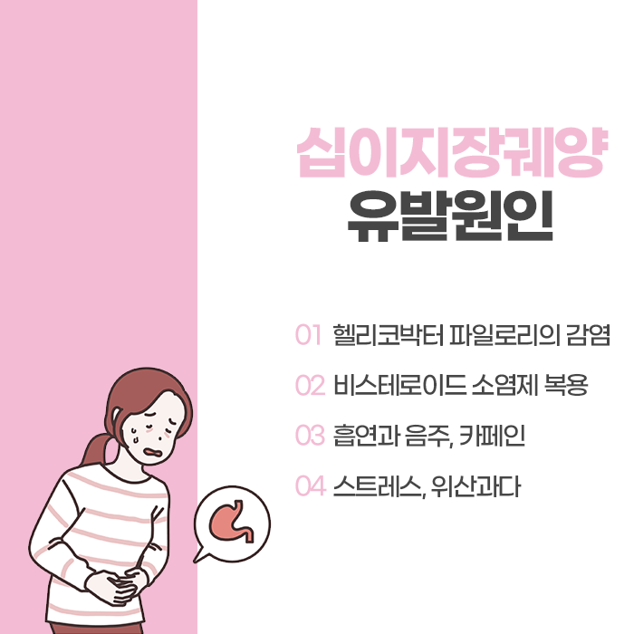 십이지장궤양의 대표적인 원인으로는 헬리코박터 파일로리균 감염과 과도한 위산 분비가 꼽힙니다. 이 균은 위와 십이지장 점막에 서식하며 점막 손상을 유발하지만, 감염 초기에는 증상이 없는 경우가 많습니다. 그러나 일부에서는 점차 염증을 일으키고 궤양으로 발전할 수 있습니다. 여기에 불규칙한 식습관, 잦은 음주와 흡연, 진통제나 소염제 장기 복용, 지속적인 스트레스, 과로 등도 위험 요인으로 작용합니다. 또한 유전적 소인이나 매우 자극적인 음식 섭취 습관도 궤양 발생 가능성을 높입니다.