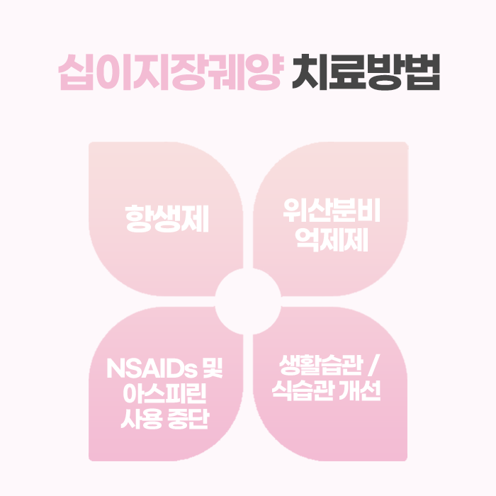 십이지장궤양의 치료는 약물로 대부분 호전이 가능합니다. 위산 분비 억제제나 제산제는 궤양 부위가 회복될 수 있는 환경을 만들어 주며, 헬리코박터균이 확인되면 항생제와 위산 억제제를 함께 사용하는 제균 치료를 시행합니다.