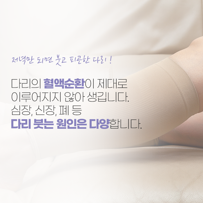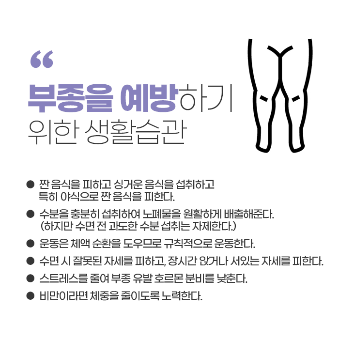 또한 걷기, 가벼운 스트레칭, 자전거 타기, 수영과 같은 유산소 운동은 혈액과 림프 순환을 원활하게 만들어 부종 개선 효과가 있습니다. 장시간 같은 자세를 유지해야 한다면, 중간중간 다리 스트레칭과 체위 변경으로 혈액 순환을 돕는 것이 좋습니다.