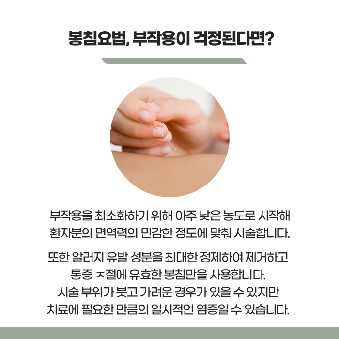 봉침은 체력 소모가 있는 치료이기 때문에 과로 상태이거나 면역력이 크게 떨어진 시기에는 적합하지 않을 수 있습니다. 치료 전에는 반드시 충분한 상담을 통해 알레르기 여부와 전신 상태를 확인하는 과정이 선행되어야 합니다.