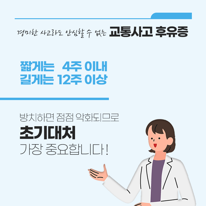 치료와 더불어 올바른 자세 유지, 생활 속 스트레칭과 골반·척추 안정 운동, 충분한 수면과 영양 섭취, 스트레스 관리가 함께 이루어지면 회복 속도를 앞당기고 보다 편안한 일상으로 복귀할 수 있습니다. 장기적으로는 사고 후 관리가 반복적인 통증, 근육 경직, 자세 불균형, 만성 피로, 정서적 불안, 집중력 저하와 같은 문제를 예방하는 핵심 수단이 됩니다. 사고 이후 나타나는 미세한 불편이라도 무시하지 않고 체계적으로 관리하면 회복 기간을 줄이고 삶의 질을 유지할 수 있으며, 전신 기능과 심리적 안정까지 도모할 수 있습니다. 따라서 교통사고 직후의 초기 관리와 장기적인 생활습관 개선이 중요합니다.