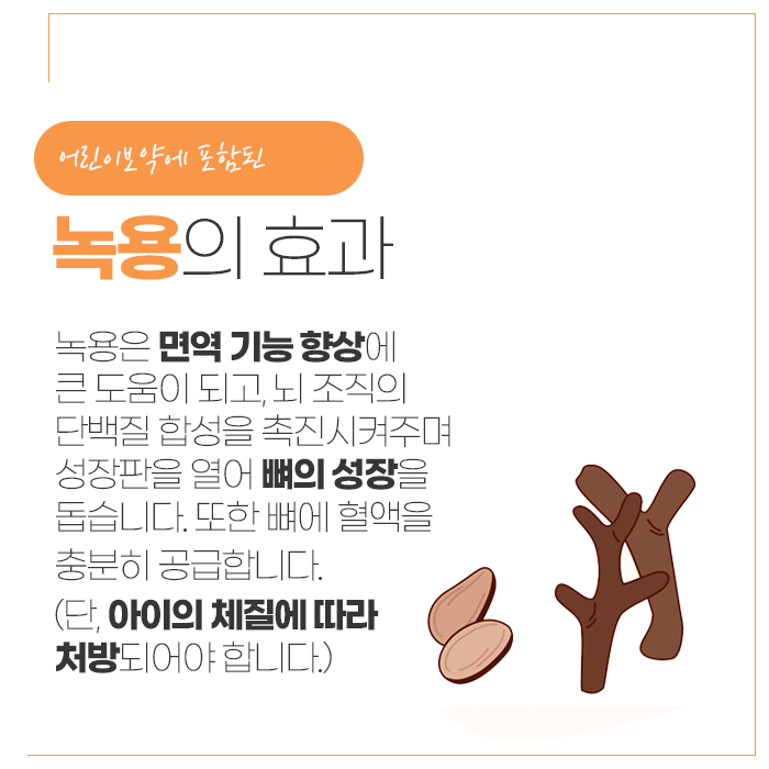한의학에서는 성장기 어린이의 활력을 북돋기 위해 자연에서 얻은 재료를 활용해 왔습니다. 그중 녹용은 기운을 북돋고 순환을 원활하게 하는 데 쓰여 온 대표적인 재료입니다. 쉽게 피로해지는 아이가 일상 활동을 보다 안정적으로 이어가도록 돕고, 전반적인 몸 상태를 부드럽게 조율하는 데 도움을 줄 수 있습니다.