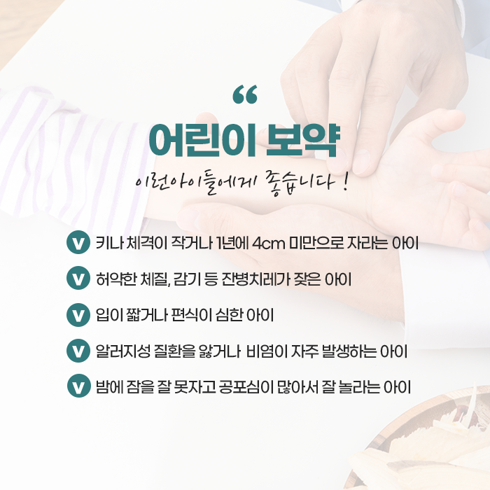 위장이 약하거나 식욕이 떨어지는 아이는 영양 흡수를 돕는 방식으로, 잦은 감기나 비염이 있는 경우에는 폐 기능을 튼튼히 하는 방식으로 처방이 달라집니다.