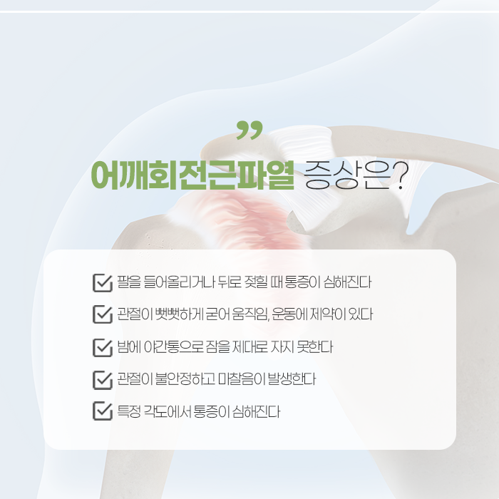회전근개 손상은 어깨를 둘러싸고 있는 네 개의 힘줄 가운데 일부가 닳거나 찢어지면서 기능에 문제가 생기는 상태를 말합니다. 이 구조는 팔을 들어 올리고 회전시키는 움직임을 안정적으로 유지하는 데 중요한 역할을 하기 때문에, 손상이 발생하면 일상적인 동작에서도 불편함이 쉽게 나타납니다. 초기에는 운동 후 어깨가 묵직하거나 가벼운 통증이 느껴지는 정도로 시작되지만, 시간이 지나면서 통증의 강도가 점차 뚜렷해지고 움직임 범위가 줄어드는 양상을 보이기도 합니다. 팔을 들어 올릴 때 특정 구간에서 통증이 집중되거나, 일정 각도 이상으로는 움직이기 어려운 경우도 흔하게 나타납니다. 특히 밤에 통증이 심해지는 경우가 많아, 누워 있는 자세에서 불편감이 커지고 수면이 방해받는 일이 잦아질 수 있습니다.