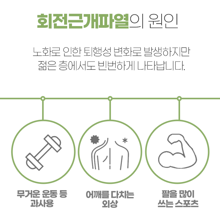 증상이 진행되면 어깨 주변의 힘이 눈에 띄게 약해지고, 팔을 움직일 때 걸리는 느낌이나 마찰음이 느껴질 수 있습니다. 심한 경우에는 팔을 옆으로 들어 올리는 기본적인 동작조차 어려워지면서 옷을 입거나 머리를 빗는 일 같은 일상 행동에도 제약이 생깁니다. 이러한 손상은 나이가 들면서 힘줄의 탄력이 떨어지는 과정에서 자연스럽게 발생하기도 하지만, 반복적인 사용 역시 큰 영향을 미칩니다. 팔을 머리 위로 자주 들어 올리는 동작이 많은 운동이나 작업 환경은 부담을 높이는 요인으로 작용합니다. 예를 들어 공을 던지는 동작이 많은 스포츠나 라켓을 사용하는 활동, 혹은 팔을 반복적으로 올리는 직업군에서 발생 빈도가 높은 편입니다. 또한 넘어지면서 어깨를 짚거나 직접적인 충격을 받는 경우 갑작스럽게 손상이 생기기도 합니다.