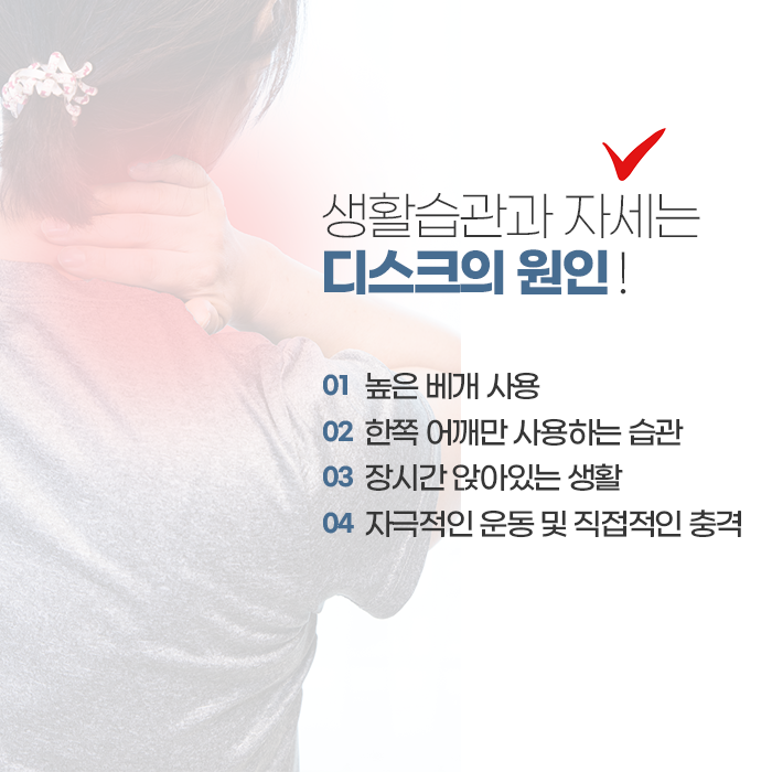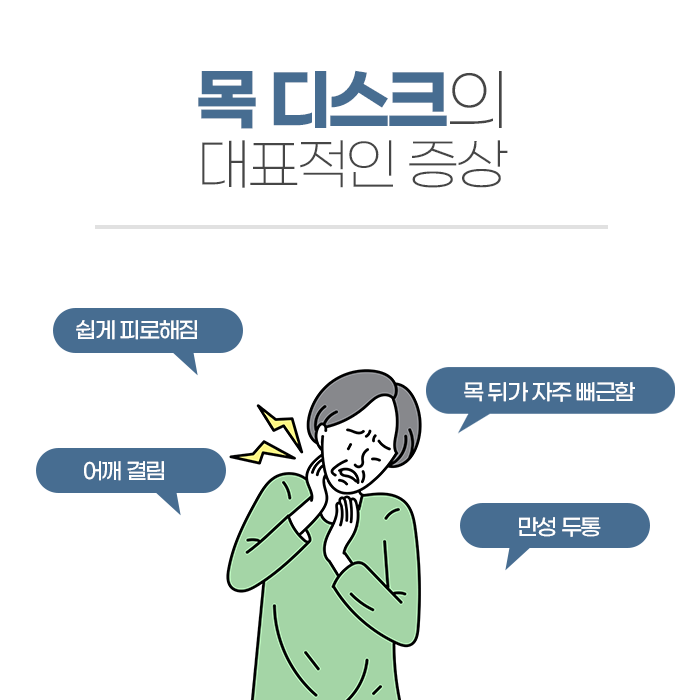 이와 같은 압박이 계속되면 내부 조직에 미세한 손상이 반복되고, 시간이 지나면서 형태가 변하거나 바깥쪽으로 밀려나오는 변화로 이어질 수 있습니다. 여기에 무거운 물건을 들 때의 무리한 동작이나 갑작스러운 충격, 나이가 들면서 나타나는 변화까지 더해지면 구조물의 탄력이 감소하고 수분이 줄어들어 손상 가능성이 더욱 높아집니다. 초기에는 목 주변이 뻐근하거나 움직일 때 불편함을 느끼는 정도로 시작되는 경우가 많지만, 이를 그대로 두면 통증이 어깨나 등, 팔 방향으로 퍼질 수 있습니다. 경우에 따라 손끝 저림이나 감각 둔화가 나타나기도 하며, 물건을 쥐는 힘이 약해지는 등 일상 동작에도 영향을 줄 수 있으며 경추를 넘어 전반적인 척추까지 불편함이 커질 수 있기 때문에 주의가 필요합니다.