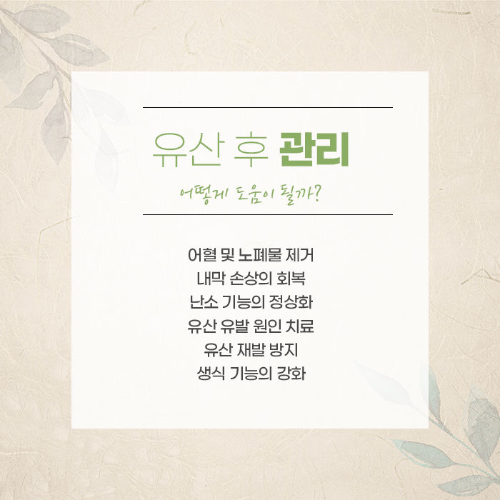 유산이 확인되면 자연적인 배출을 기다리거나 약물 또는 시술을 통해 자궁 내부를 정리하는 과정을 거치게 됩니다. 이후에는 감염을 막고 자궁이 안정적으로 회복될 수 있도록 관리하는 단계가 중요합니다. 이 시기에는 몸이 쉽게 차가워지거나 피로가 길게 이어지고, 하복부 불편감이 남는 경우가 많아 충분한 휴식이 필요합니다.