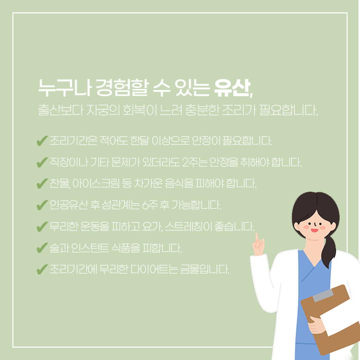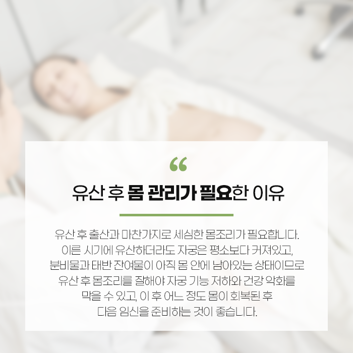 유산 이후의 회복 과정은 자궁 환경을 안정시키고 체력을 보완하는 데 초점이 맞춰집니다. 충분한 휴식과 균형 잡힌 식사, 규칙적인 생활 습관을 유지하는 것은 회복 과정에서 중요한 역할을 합니다. 유산은 예상치 못하게 발생하는 경우가 많지만, 그 과정을 혼자 감당할 필요는 없습니다. 회복 기간에는 자신을 다그치기보다 몸과 마음을 돌보는 데 집중하는 것이 중요합니다. 시간을 두고 천천히 일상으로 돌아가면서 컨디션을 점검하는 과정은 다음 단계를 준비하는 데 의미가 있습니다. 자궁 회복과 체력 보강, 정서적인 안정이 함께 이루어질 때 이후 임신 과정도 보다 안정적으로 이어질 가능성이 높아질 수 있습니다.