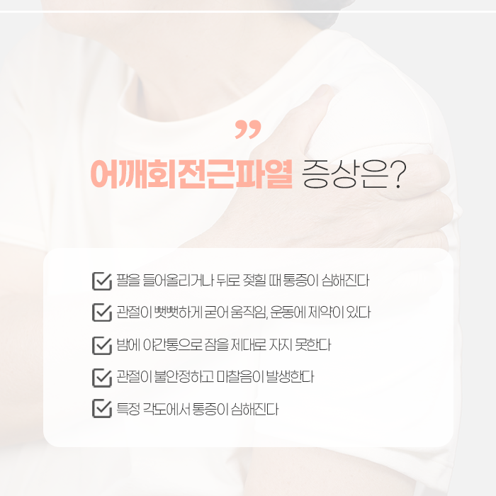 증상은 다양합니다. 초기에는 어깨가 뻐근하거나 무겁게 느껴지는 정도지만, 시간이 지나면 특정 각도에서 찌릿한 통증이 나타나거나, 팔을 들어 올리거나 뒤로 돌릴 때 제한이 생기기도 합니다. 심한 경우 밤에 통증이 심해져 수면이 방해받고, 팔을 움직일 때 걸림이나 불안정감을 느낄 수 있습니다. 장기적으로 방치하면 관절의 운동 범위가 줄고 근육 위축이 발생하며, 일상적인 활동이나 스포츠 수행에도 지장을 초래합니다.