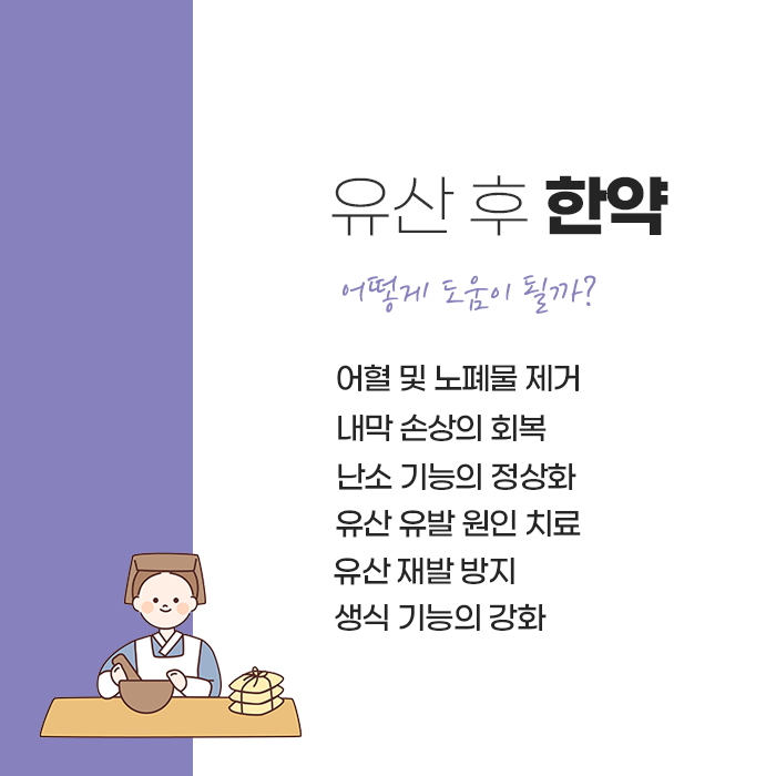 한의학적 접근은 특정 증상만을 다루는 데 머무르지 않고, 전신 상태를 함께 살피며 회복을 돕는 데 목적이 있습니다. 신체적인 회복과 더불어 정서적인 안정도 중요한 부분입니다. 상실감이나 불안, 죄책감 등 다양한 감정이 나타날 수 있으므로 이를 자연스럽게 받아들이고 조절할 수 있는 환경이 필요합니다. 가족이나 배우자의 지지, 상담, 편안한 생활 환경은 심리적 회복에 긍정적인 영향을 줄 수 있습니다.